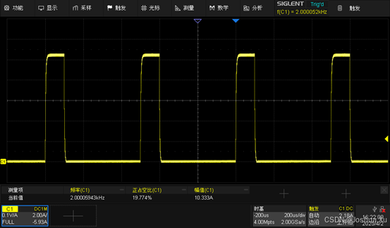 例如,高电平有效时,20%的占空比,可以理解为2kHz20%高电平(正脉冲)的PWM波,也可以理解为2kHz80%低电平(负脉冲)的PWM波。当占空比为0%时,电机完全停止;当占空比为100%时,电机以最大速度运行。